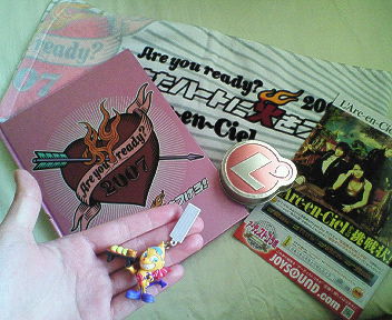 パンフレットと、マフラータオルと、お香の入ったカンと、シエルちゃんストラップ!あとは入り口でもらった案内みたいなやつ!